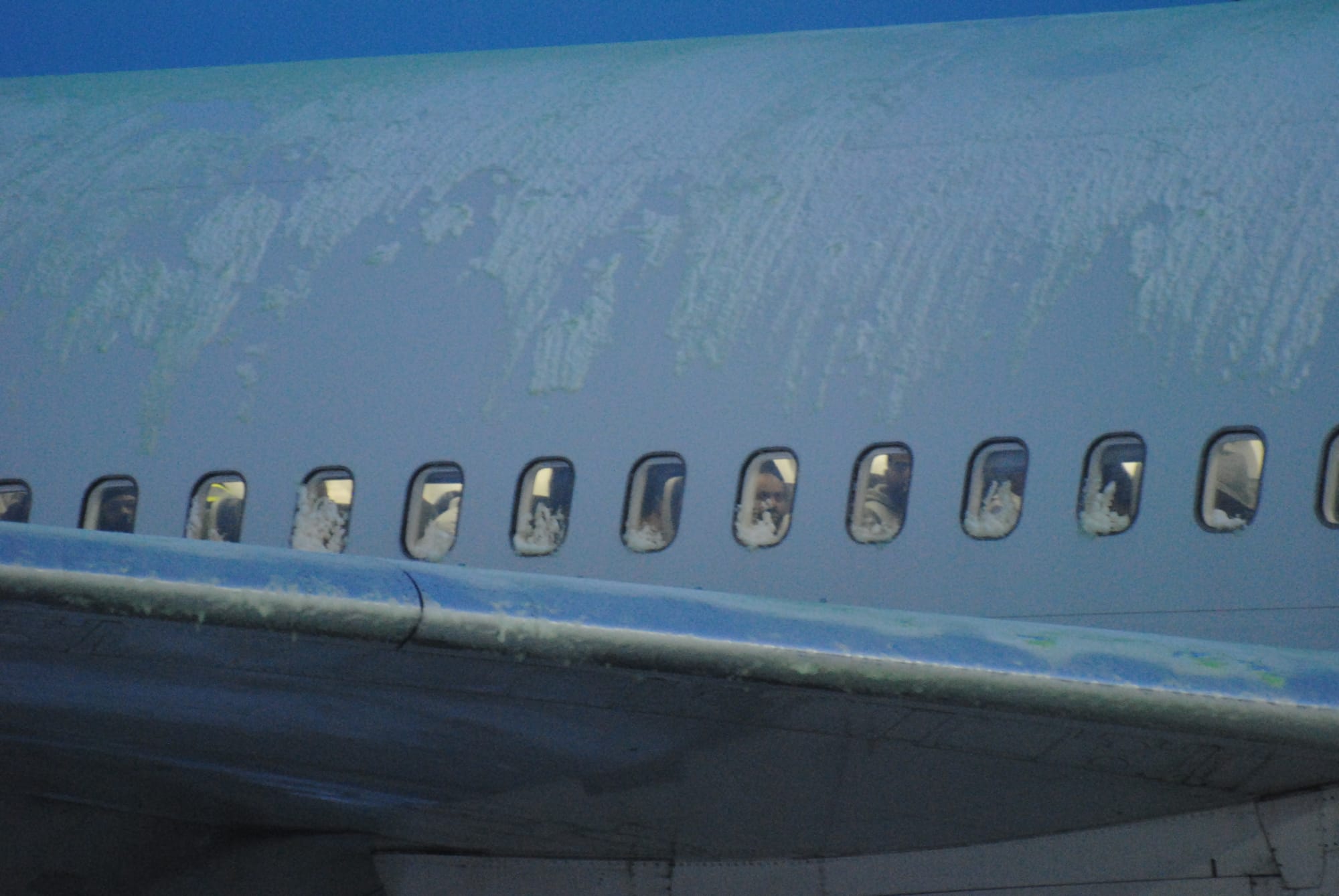 The aircraft was finally towed to an auxiliary terminal on Monday afternoon, where passengers disembarked. Migrants were held in the terminal overnight.