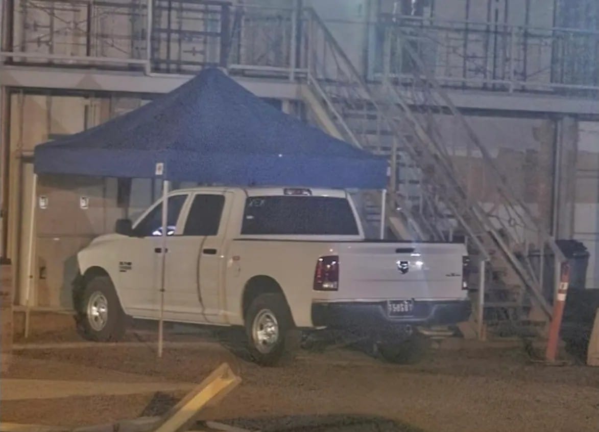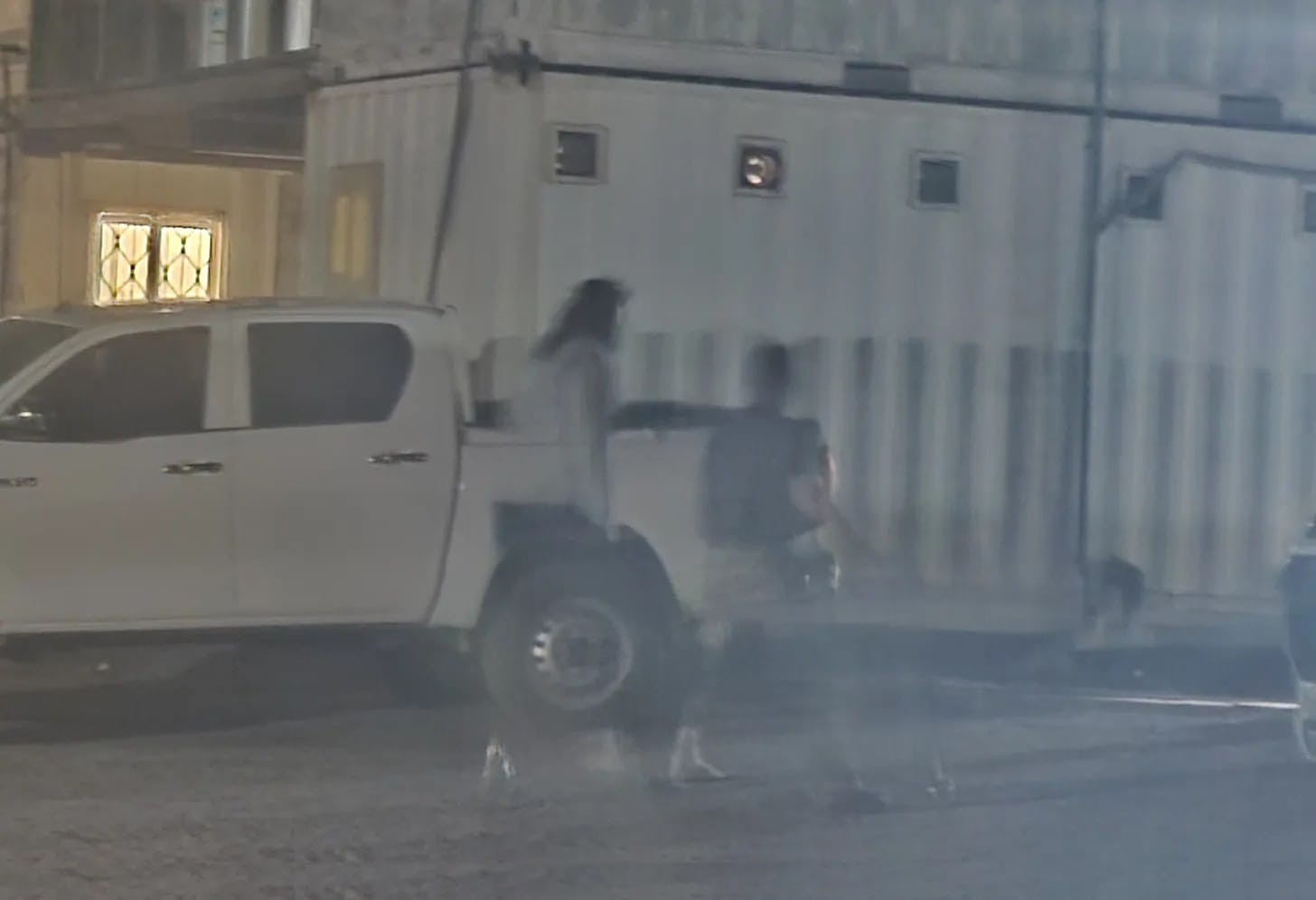 Conditions were, of course, even harsher for the detainees. They were housed together in a cramped shipping container ordinarily used as a conference room, where they were also exposed to the fumes. There was no plumbing or natural light, since, the source said, the only window was on the door to the conference room and a Navy Police truck sat idling under a tent in front the door the entire time the detainees were there. Satellite images confirm the presence of the truck and tent in the area of the base pictured in a photograph provided by the source, showing the outside of the room where he said the detainees were held.