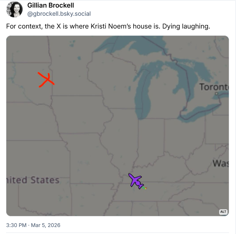 As for her claim she only flew on the f̶u̶c̶k̶j̶e̶t̶ BBJ once, it’s possible that’s true? Archive flight data shows four instances in which the aircraft used a callsign indicating there was a high-level official onboard (EXEC1F). One flew at a time we know Noem was in DC and so couldn't have been her. Another, on Jan. 29, made a stop in Watertown and so almost certainly was her. The other two were flights between Joint Base Andrews and West Palm Beach – the nearest airport to Mar-a-Lago, and I haven’t been able to determine who the “exec" was onboard.