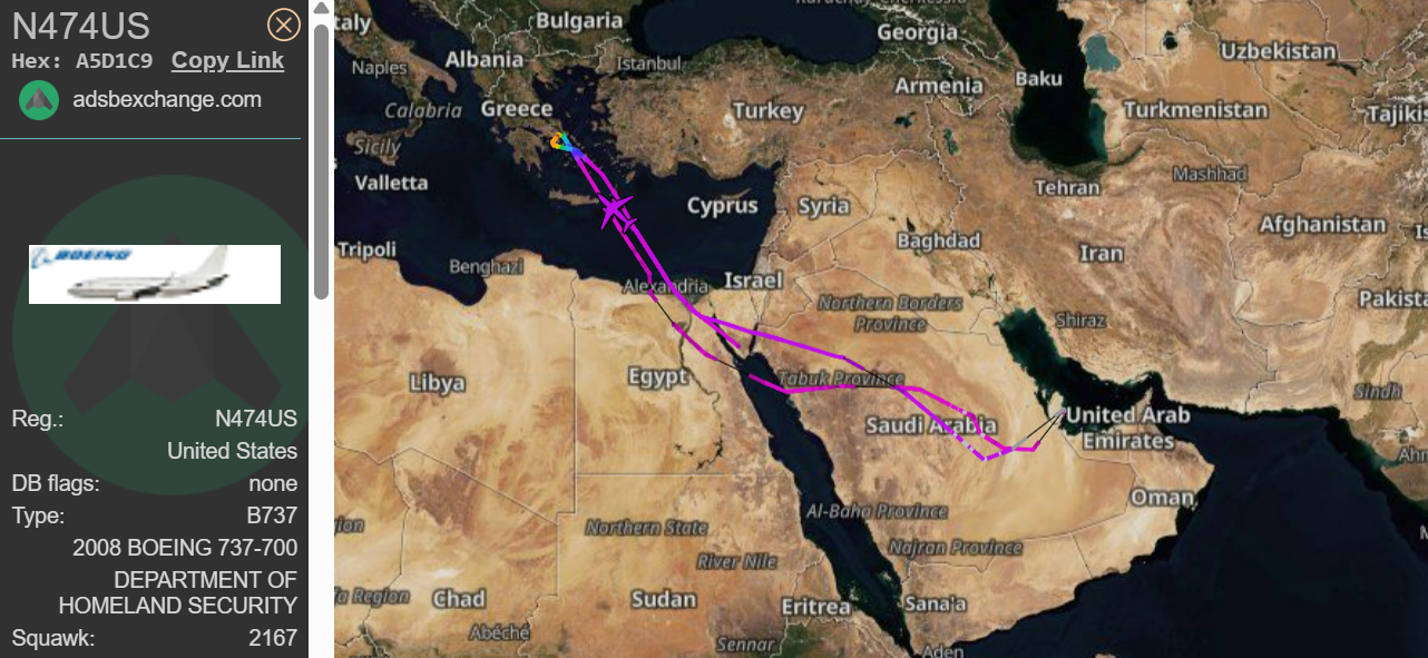 Where it went next was not on my bingo card of predictions: Crete. Since then it has made at least five round trips between Europe and the Middle East, sometimes using a callsign that, according to the ICE flight tracker “JJ in DC,” is used by the State Department.