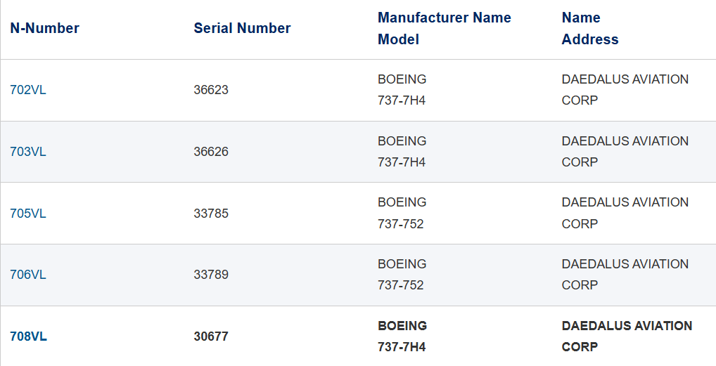 The planes’ then-owner, Valkyrie Aviation Holdings Group, had reserved eight more n-numbers: N472US through N479US, Trevithick noted. He also pointed out the WaPo story about Daedalus and the DHS deportation fleet, but given this 737’s luxury interior, it seemed “ill-suited to conducting deportation flights,” he wrote, and could not say if Daedalus and Valkyrie were related.