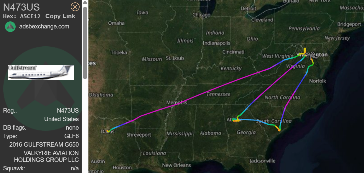 And, as I write this, another one just stepped into the light. Some time in the last few months, it’s hard to tell when, the reserved n-number N472US was also assigned to a G650. This one was registered to a non-mythically themed company – Vigilant Aviation Holdings Group – at a Delaware address frequently used by anonymous shell companies. This plane has spent the last month at Ardmore Municipal Airport in Oklahoma – yet another place airplanes go when they need a refresh.