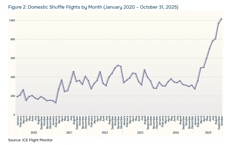 Human Rights First recorded 199 removal flights and a record number of domestic shuffle flights in one month: 1,014. Domestic shuffles have skyrocketed in the last few months, as the report shows here: